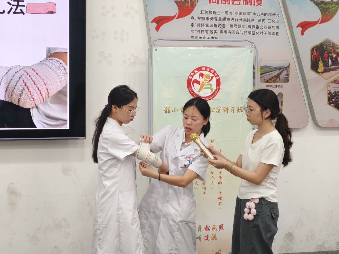 急救知識宣講,醫(yī)學(xué)院實踐隊隊員連夢瑤首先聚焦繃帶包扎技能。她針對日常創(chuàng)傷場景,結(jié)合真實案例,系統(tǒng)演示包扎步驟與操作要點,細(xì)致解答村民對傷口處理的困惑,并邀請村民現(xiàn)場模擬實踐。在實踐隊員一對一指導(dǎo)下,將復(fù)雜的急救知識轉(zhuǎn)化為易于掌握的實用本領(lǐng)。