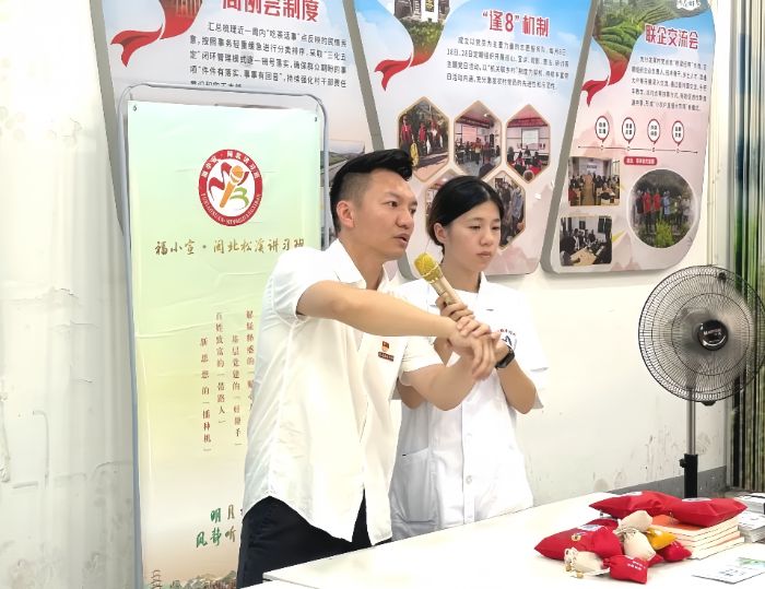隨后,連夢瑤同學(xué)生動演示海姆立克急救法。圍繞異物梗阻的緊急狀況,她借助道具,規(guī)范演示腹部沖擊等核心動作,組織村民開展互動實操,通過即時糾正發(fā)力角度與操作偏差,讓這項守護(hù)生命的"黃金技能"真正內(nèi)化于心,成為村民隨時能夠本能調(diào)用的生命守護(hù)屏障。