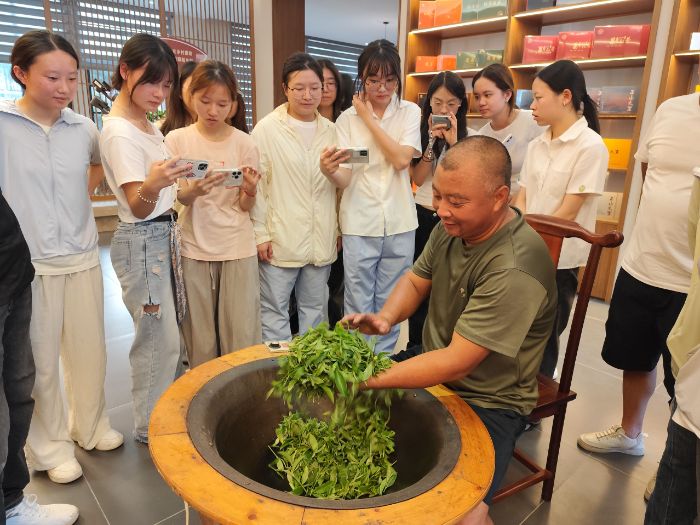 殺青灶前,醫(yī)學(xué)院實踐隊在何師傅指導(dǎo)下學(xué)技。“高溫快炒,均勻翻動”,何師傅邊示范邊講解。隊員們實操時,從火候失當(dāng)?shù)秸莆辗垂?jié)奏,漸入佳境。揉捻環(huán)節(jié),大家遵循“剛?cè)岵?jì)”要領(lǐng),讓茶青在掌心成型;烘焙階段,守著炭火精準(zhǔn)控溫,使茶香于文火中凝練。一道道工序?qū)嵺`,皆是對松溪制茶匠心的深度傳承。