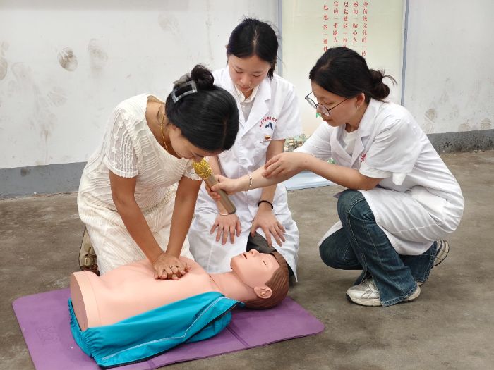 在最后的心肺復(fù)蘇教學(xué)環(huán)節(jié)中,連夢瑤同學(xué)針對心跳呼吸驟停的危急情形,詳細(xì)闡釋按壓部位、頻率及通氣要點,通過標(biāo)準(zhǔn)示范與實操練習(xí)相結(jié)合的方式,及時糾正動作偏差,著重強(qiáng)調(diào)"黃金4分鐘"的施救關(guān)鍵,切實為鄉(xiāng)村筑牢生命急救防線。