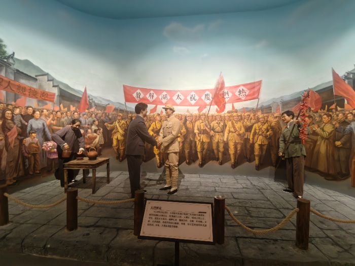 太湖縣作為鄂豫皖革命根據(jù)地的重要組成部分,有著深厚的紅色積淀。實踐期間,團隊成員循著歷史足跡,先后參觀了革命歷史紀念館、烈士紀念碑、英烈事跡長廊和烈士墓區(qū)。在紀念館內(nèi),大家仔細觀看 300 余件革命文物 —— 從太湖游擊隊使用過的土槍、泛黃的抗日傳單,到烈士趙文楷的家書、渡江支前民工用過的扁擔(dān),每件展品都承載著具體可感的歷史記憶。
