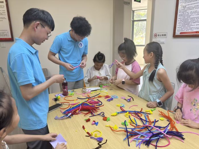 活動(dòng)現(xiàn)場(chǎng),孩子們領(lǐng)取彩紙、安全剪刀、扭扭棒等材料后,實(shí)踐團(tuán)成員先示范基礎(chǔ)剪紙技巧,引導(dǎo)從對(duì)稱圖形入手。孩子們專注剪出五角星、愛(ài)心及傳統(tǒng)窗花紋樣;扭扭棒手工區(qū)則充滿歡笑,孩子們將其創(chuàng)造成小花發(fā)卡、蜻蜓、蝴蝶、手環(huán)等各式造型。實(shí)踐團(tuán)成員穿梭指導(dǎo)工具安全使用與造型方法,鼓勵(lì)觀察嘗試,引導(dǎo)學(xué)習(xí)布局色彩搭配,感受耐心與合作的重要性。
