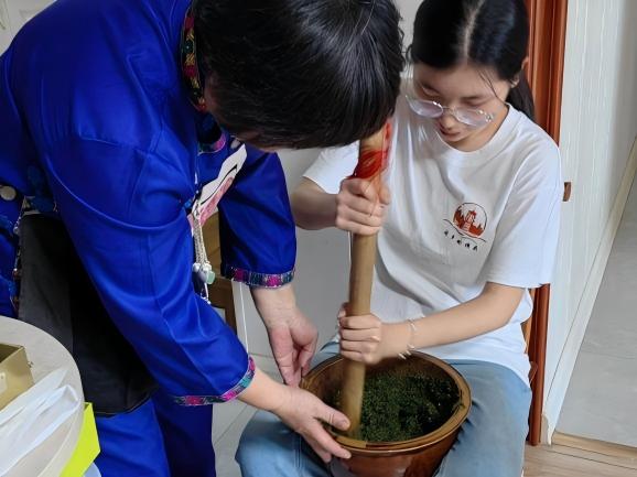 圖2:實(shí)踐隊(duì)隊(duì)員在江玫麗老師指導(dǎo)下參與擂茶制作工藝 胡婧琳通訊員攝