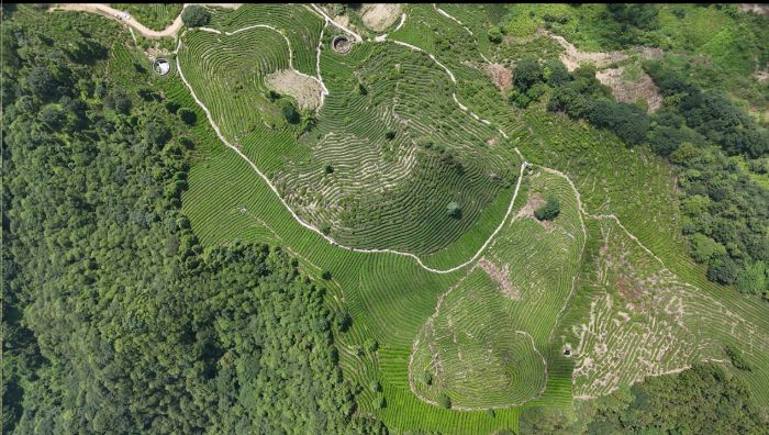 圖1 無(wú)人機(jī)俯瞰白鶴村階梯茶園,綠浪直達(dá)天際 唐銳 供圖