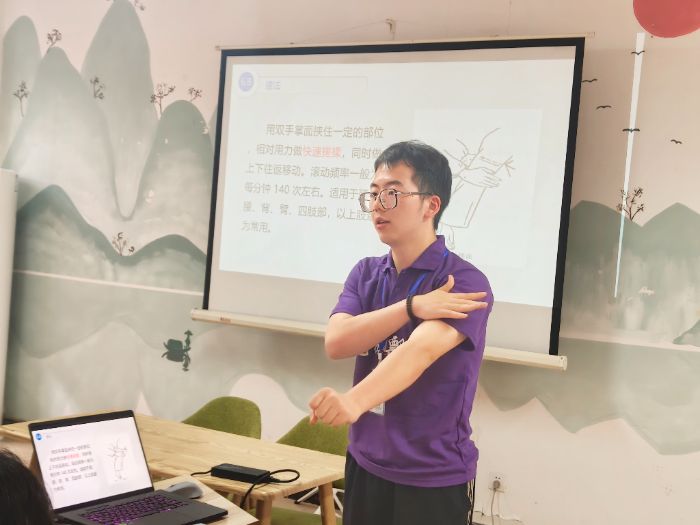 健康是老年人最根本的需求,先鋒隊(duì)以“預(yù)防-干預(yù)-養(yǎng)護(hù)”為邏輯,搭建起立體式康養(yǎng)服務(wù)體系。初見老人時(shí),隊(duì)員們先以通俗易懂的語言闡釋穴位按摩對(duì)緩解疲勞、改善睡眠、增強(qiáng)免疫力的功效,隨后通過“講解+演示+實(shí)操”的三重模式,系統(tǒng)呈現(xiàn)㨰法、揉法、按法等十余種傳統(tǒng)按摩手法。當(dāng)隊(duì)員們的手掌在老人肩頸、腰背等部位精準(zhǔn)施力,僵硬的肌肉逐漸舒展,酸脹感化作輕松,老人們的贊嘆聲成為對(duì)傳統(tǒng)醫(yī)學(xué)魅力最生動(dòng)的注解。