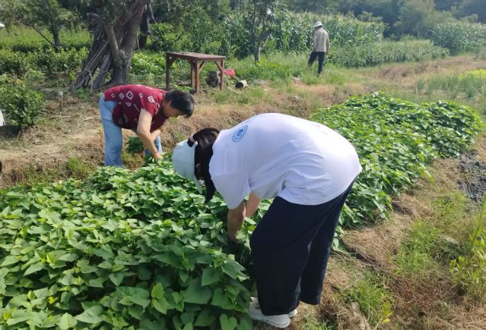 農(nóng)耕啟蒙:俯身壟間,汗水澆灌助農(nóng)初心 小分隊(duì)成員隨西山當(dāng)?shù)匾晃黄牌徘巴说亍M局校牌沤榻B,當(dāng)?shù)馗鞔寰蟹N植時(shí)令果蔬的傳統(tǒng),其中青種枇杷最為知名,幾乎家家戶戶都有種植。菜地種植園已經(jīng)有婆婆們?cè)诓烧卟肆耍箳熘淖锨选⒛劬G的地瓜藤,在婆婆們指導(dǎo)下,成員們迅速掌握其采摘技巧,同時(shí)了解到田地間多種果蔬的生長(zhǎng)周期和日常管理技巧。這場(chǎng)與土地的對(duì)話,讓團(tuán)隊(duì)成員對(duì)農(nóng)耕生活有了直觀認(rèn)識(shí),也為后續(xù)助農(nóng)活動(dòng)奠定了基礎(chǔ)。