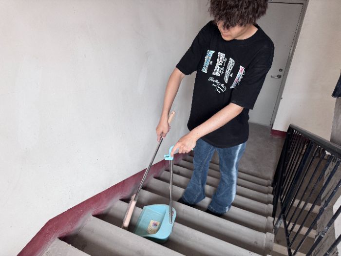 圖為實(shí)踐團(tuán)成員進(jìn)行打掃衛(wèi)生收尾工作