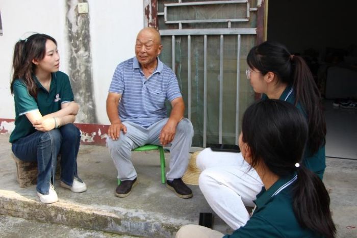 圖為“紅心潤心團(tuán)隊”在和村聽老村長講述“和村蘋果”的發(fā)展歷程