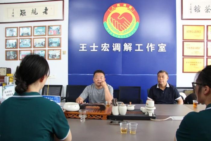圖為“紅心潤心團(tuán)隊”在王士宏調(diào)解工作室了解“一杯茶”調(diào)解法