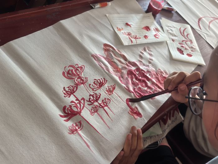 志愿者通過有趣的故事分享為孩子們講述了中國畫的發(fā)展歷程,展示歷代名家的經(jīng)典畫作。在繪畫創(chuàng)作體驗中,孩子們在志愿者們的協(xié)同下將顏料倒入杯中用水稀釋,將毛筆蘸取顏料后在宣紙上描繪,每個小朋友都發(fā)揮自己的想象,有用黑色顏料畫竹子的,有用黃色顏料畫芒果的,還有用紅色顏料畫了一片花海。當(dāng)志愿者很疑惑一個小朋友的畫中為什么要空出一大片什么都不畫時,小朋友很驕傲地說:“這叫留白!”孩子們在這堂課中也受益匪淺,讓他們體會線條粗細、濃淡變化中蘊含的美感,這種對“意境”的感知,會成為他們獨特的審美儲備,也會慢慢培養(yǎng)他們發(fā)現(xiàn)美、表達美的能力。