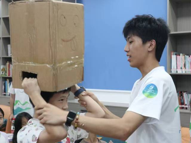 圖為隊員林子穎和隊員郭梓鋒教小朋友動作