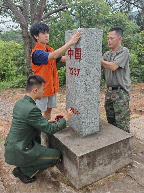 在山林環(huán)繞的邊境之地,團(tuán)隊成員與巡邊員攜手開展界碑描紅。身著軍裝、志愿服與迷彩服的身影,圍繞“中國1237”界碑,以專注神情、鄭重動作,賦予“中國紅” 嶄新光彩。這一抹鮮艷,不僅是對界碑的莊嚴(yán)維護(hù),更是青春力量與戍邊使命的交融,讓“守護(hù)國土”的誓言,在界碑旁深深扎根、熠熠生輝。