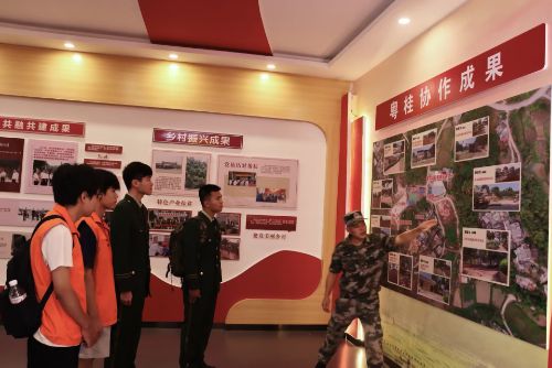 在陳列著粵桂協(xié)作、鄉(xiāng)村振興成果的展廳內(nèi),巡邊員潘武文為團(tuán)隊成員講述那逢屯建設(shè)歷史。實(shí)踐隊員仔細(xì)聆聽,專注凝視畫面與講解者。這場跨越實(shí)踐與歷史的講述,傳遞的不僅是發(fā)展歷程,更是基層建設(shè)的堅守與協(xié)作,讓 “探尋振興路”的行動,在展板前成為觸摸奮斗脈絡(luò)的生動課堂。
