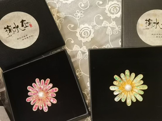 采訪中,屈敏老師帶團(tuán)隊來到展柜前,介紹自己的得意之作。展柜里的絨花作品形態(tài)逼真、色澤雅致,讓隊員們驚嘆不已:蠶絲在銅絲骨架上堆疊出立體花型,層疊中藏著自然的生長韻律;每一縷絨毛都舒展服帖,轉(zhuǎn)折處不見絲毫雜亂;近觀可見細(xì)節(jié)巧思——一朵極小的梅花,絨絲細(xì)如蜂腿,卻將花瓣的嬌嫩感展現(xiàn)得活靈活現(xiàn)。
