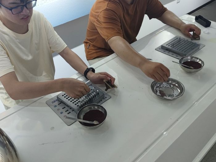 7月2日,團隊首站走進南通精華制藥集團,探訪國家級非遺“王氏保赤丸制作技藝”在彌漫著濃厚歷史氣息的文化館內(nèi),非遺傳承人王師傅為學(xué)子們揭開了這項百年技藝的神秘面紗——從牛黃、朱砂等名貴藥材的嚴(yán)苛甄選與古法炮制,到起模、蓋面、打光等21道精細入微的手工工序。當(dāng)王師傅現(xiàn)場展示手工起模絕活,并強調(diào)“一粒合格藥丸需經(jīng)300余次手工泛制,重量誤差嚴(yán)控在±3%之內(nèi)”時,實踐團隊成員們無不屏息凝神,為這毫厘間的極致匠心所震撼。他們親手體驗篩藥環(huán)節(jié),并將一粒粒凝結(jié)著古老智慧與匠人溫度的藥丸珍藏,感受技藝的溫度。