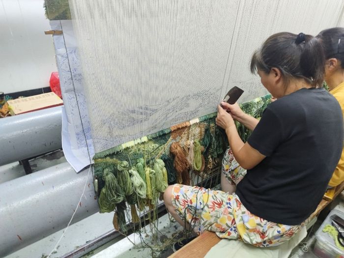 8月7日,團隊深入如皋絲毯藝術(shù)博物館。一幅幅流光溢彩的絲毯杰作,以百萬計的“8”字手工繞結(jié)與精妙絕倫的剪花工藝,無聲訴說著“一寸絲毯千寸心”的極致追求。在織造車間,匠人們指尖翻飛如梭,學(xué)生們得以零距離觀察、觸摸并嘗試基礎(chǔ)打結(jié)手法。絲線在指尖穿梭的韻律與力量,讓學(xué)子們深刻體會到每一寸經(jīng)緯間凝聚的專注與歲月。