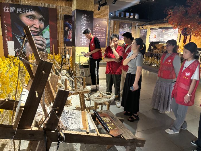 圖為成員們參觀壯族服飾織衣器具,工作人員介紹制作流程 朱鳳汝 供圖