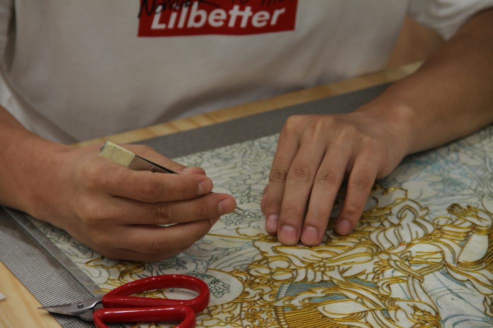 在包俊杰老師的介紹下,我們了解到了掐絲琺瑯的輝煌歷史與其自身不凡。而老師也給我們詳細介紹了它的制作過程。掐絲琺瑯(又稱景泰藍)的制作是一場融合耐心與匠心的藝術(shù)修行,歷經(jīng)多道工序方能成就流光溢彩的作品,每一步都凝結(jié)著古人的智慧與匠人的執(zhí)著。它的制作首先需根據(jù)設(shè)計選取銅、銀等金屬材質(zhì)打造胎體,要經(jīng)過裁剪、敲打、焊接等工序,確保胎體平整堅實。而后便是掐絲:將柔軟的銅絲(也用鍍金鋁絲)用鑷子掰彎、掐制成設(shè)計好的紋樣,再用特制膠水將銅絲粘在胎體表面。這一步就像人的骨骼一樣,掐絲便是整幅作品的骨骼。最后再進行賦予色彩的點藍和打磨與鍍金。