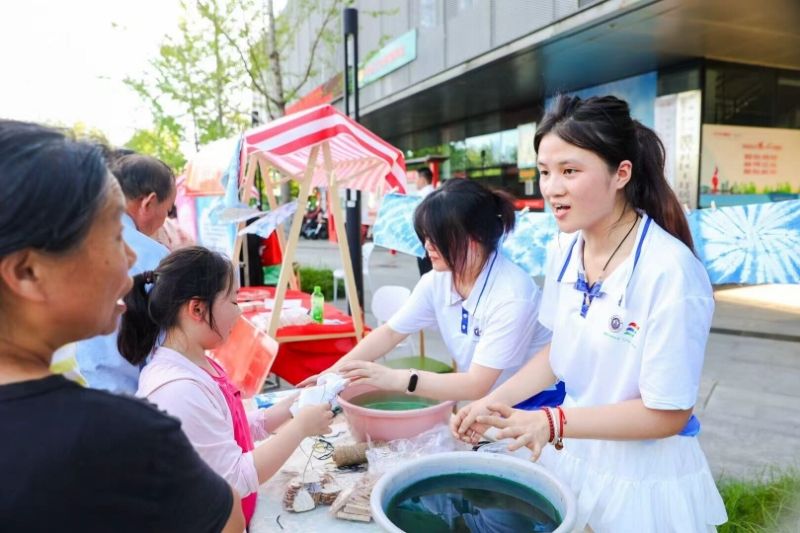 圖為團(tuán)隊(duì)成員指導(dǎo)居民扎染。 趙天宇 攝