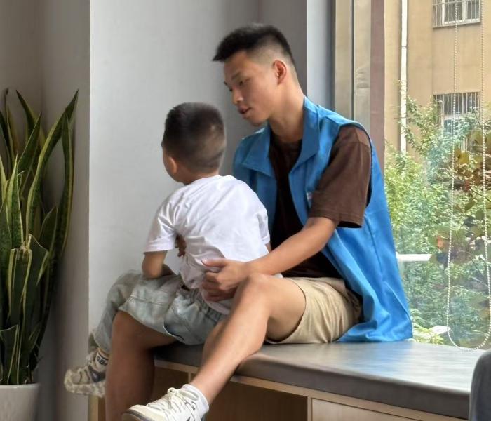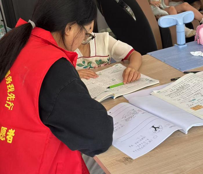 在溫馨的室內(nèi)環(huán)境里,一位志愿者,正專注地輔導(dǎo)孩子做作業(yè)。孩子坐在一旁,認(rèn)真跟著志愿者的講解思考。桌上攤開著課本與練習(xí)冊,滿是知識的印記。還有孩子愜意地躺在按摩椅上,整個場景傳遞出溫暖的互助氛圍,彰顯著志愿服務(wù)助力學(xué)習(xí)、傳遞關(guān)愛的意義 。