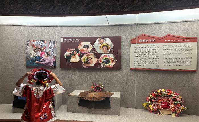 當(dāng)目光聚焦到蟳埔簪花文化展區(qū),各式簪花頭飾精致奪目,各色明艷的花朵錯(cuò)落排列,既透著漁家生活的質(zhì)樸鮮活,又藏著傳統(tǒng)美學(xué)的巧思。通過(guò)介紹,實(shí)踐隊(duì)隊(duì)員們了解到簪花不僅僅是蟳埔女獨(dú)特的裝飾,更承載著漁家祈福平安的美好愿景,是海洋文化與民俗風(fēng)情的生動(dòng)融合。從早年漁家女的日常裝扮,到如今成為備受青睞的文化符號(hào),簪花在傳承中不斷煥新,讓實(shí)踐隊(duì)員們真切體會(huì)到了非遺“古韻今風(fēng)”的生命力。