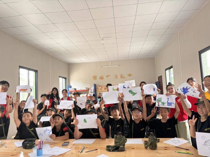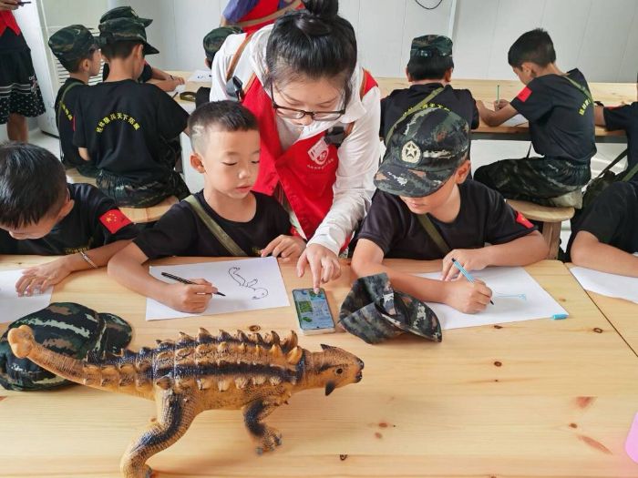 隨后,孩子們拿起畫筆,發(fā)揮天馬行空的想象力,創(chuàng)作出自己心中的恐龍世界一一五彩斑斕的翼龍、威風(fēng)凜凜的暴龍、甚至奇幻的"三頭六臂"恐龍躍然紙上,實(shí)踐團(tuán)成員們耐心指導(dǎo),與孩子們交流創(chuàng)作靈感,現(xiàn)場充滿歡聲笑語。