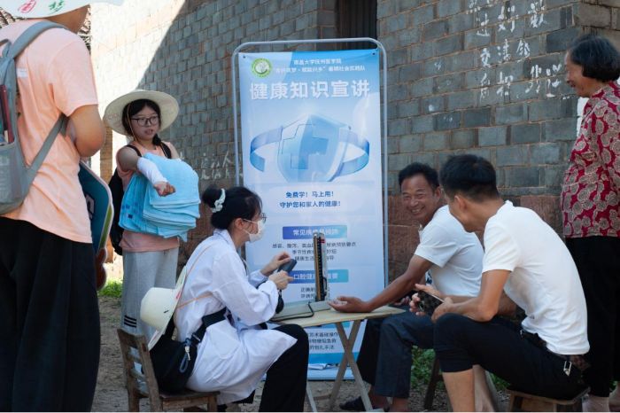 還記得我們與村醫(yī)一起去鄉(xiāng)親們家里義診時(shí),實(shí)踐隊(duì)員們親切地為鄉(xiāng)親們挽起袖子量血壓,一邊量血壓一邊詢問近況、開展調(diào)研,我們和村醫(yī)一起為鄉(xiāng)親們進(jìn)行健康宣講,針對(duì)個(gè)人情況提出健康建議。義診結(jié)束后,鄉(xiāng)親們總是會(huì)拿出西瓜招待我們,笑臉盈盈地說吃完再走。我們走訪了很多相親家,他們的熱情總讓我們倍加感動(dòng)。這樣的感動(dòng)充斥在這七天里,從田間地頭的親切指引到惠民活動(dòng)的互動(dòng)交談,無一不讓人動(dòng)容。