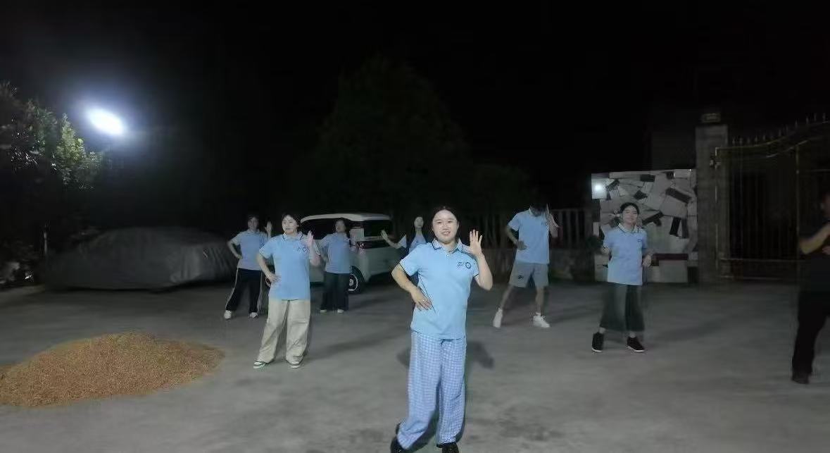 晚上8點(diǎn),小隊(duì)成員在晚餐后邀請周圍村民一起跳廣播體操,實(shí)踐隊(duì)員領(lǐng)頭帶領(lǐng)村民們在空地上跳舞;此起彼伏的笑聲,不僅對實(shí)踐隊(duì)員們的認(rèn)可也表現(xiàn)出安山村村民對實(shí)踐隊(duì)員們到來的歡迎。夜風(fēng)送來稻田的清香,混著汗水的味道。那些白天握鋤頭的手,此刻正笨拙又認(rèn)真地比劃著"心"形,在星空下閃閃發(fā)亮。