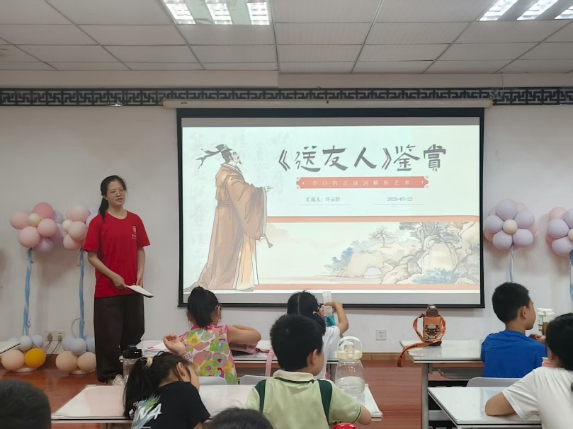 大學(xué)生志愿者充分發(fā)揮特長(zhǎng),精心準(zhǔn)備了古詩(shī)鑒賞課,分享了唐代詩(shī)人李白的《送友人》的創(chuàng)作背景,引導(dǎo)孩子們賞析“青山橫北郭,白水繞東城”“浮云游子意,落日故人情”等經(jīng)典名句的意象之美與情感之深,解讀詩(shī)人與友人依依惜別的真摯情誼。課堂上,志愿者組織孩子們集體朗誦,指導(dǎo)誦讀的節(jié)奏與情感表達(dá),并鼓勵(lì)大家分享自己對(duì)友情的理解。通過(guò)這堂精心準(zhǔn)備的古詩(shī)課,為孩子們開啟了一扇感受古典文學(xué)魅力的窗口。