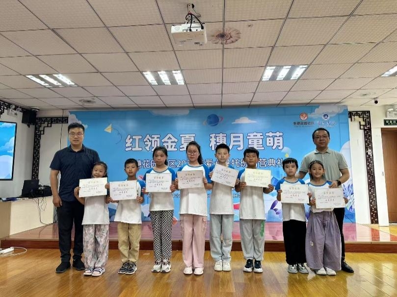 8月1日下午,在暑托班圓滿結(jié)束之際,一場(chǎng)溫馨而隆重的結(jié)業(yè)儀式在金穗花園社區(qū)活動(dòng)室舉行。儀式在孩子們充滿活力的集體舞表演中拉開序幕,整齊的動(dòng)作和燦爛的笑容展現(xiàn)了20天來(lái)的成長(zhǎng)與自信。隨后,南審澤園書院志愿者代表張歆苒同學(xué)上臺(tái)發(fā)言,深情回顧了與孩子們相處的點(diǎn)滴,分享了作為志愿者的感動(dòng)與收獲,并代表全體志愿者表達(dá)了對(duì)孩子們未來(lái)美好成長(zhǎng)的祝福。儀式上還穿插了精彩的小學(xué)生才藝展示,贏得了現(xiàn)場(chǎng)觀眾的陣陣掌聲。最具儀式感的環(huán)節(jié)是證書頒發(fā)儀式,金穗花園社區(qū)黨委書記劉林、南京審計(jì)大學(xué)澤園書院團(tuán)委書記靳淵博及暑托班班主任老師等共同為30名圓滿完成暑托班活動(dòng)、表現(xiàn)優(yōu)異的孩子們頒發(fā)了才藝之星和結(jié)業(yè)證書并合影留念。