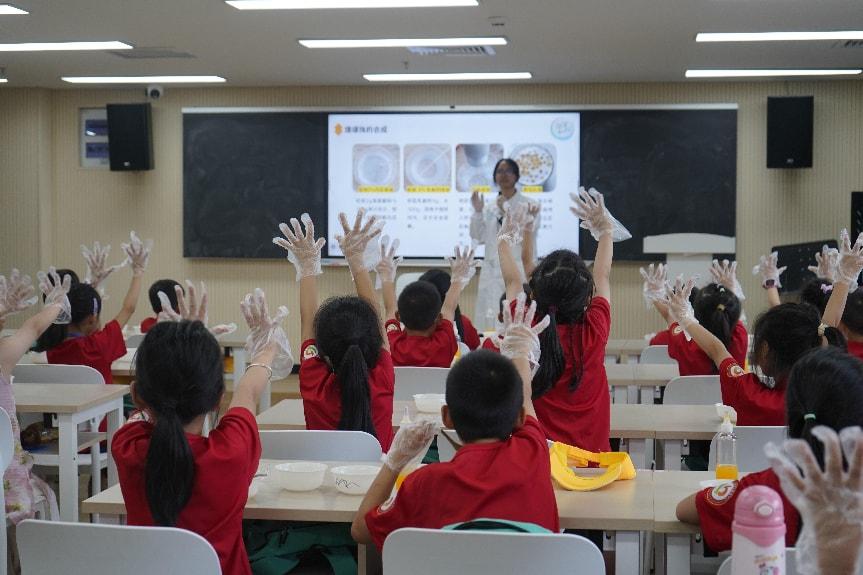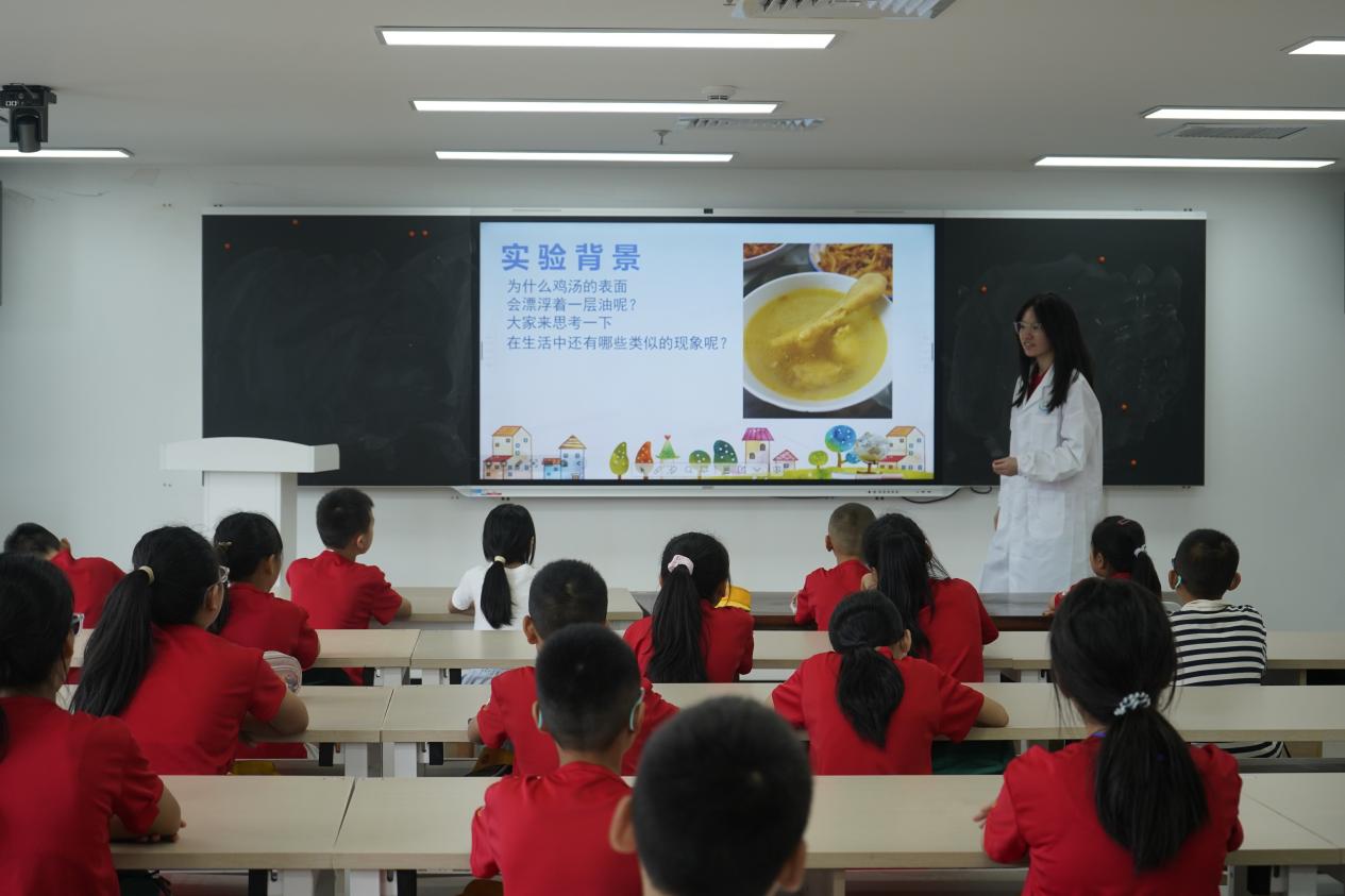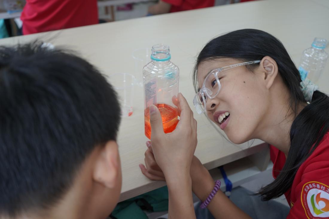 科普活動(dòng)為了啟迪孩子們的智慧,在實(shí)驗(yàn)中設(shè)計(jì)了許多思考的環(huán)節(jié),在“無字天書”的實(shí)驗(yàn)中通過一個(gè)貼近生活的問題——“為什么雞湯上面有一層油?”巧妙地引出了水油不相容的原理。用孩子們能理解的比喻解釋“火山燈”實(shí)驗(yàn):“水分子愛‘抱團(tuán)’,油分子愛‘獨(dú)處’,所以它們‘分家’啦!”孩子們?cè)隗w驗(yàn)中培養(yǎng)興趣,在探索中提出疑問,在思考中啟迪智慧,在精彩紛呈的化學(xué)實(shí)驗(yàn)中初窺世界的奧妙。
