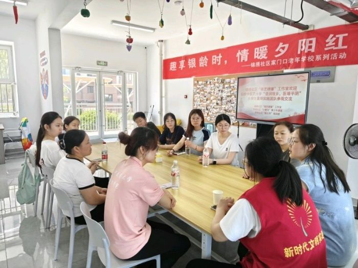 圖為志愿服務(wù)隊(duì)成員與錦繡社區(qū)工作人員圍坐交流