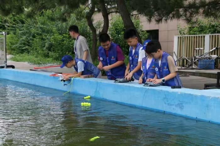 來自北京的一支團(tuán)隊(duì),剛結(jié)束海洋機(jī)器人操控賽,隊(duì)員們便帶著自己的參賽機(jī)器人與實(shí)踐團(tuán)交流。隊(duì)長(zhǎng)陳同學(xué)興奮地展示機(jī)器人的 “防纏繞螺旋槳”:“我們?cè)O(shè)計(jì)這個(gè)是為了應(yīng)對(duì)海洋里的水草,是不是也能用于黃河里的漂浮雜物?” 實(shí)踐團(tuán)成員當(dāng)即肯定創(chuàng)意,并現(xiàn)場(chǎng)與孩子們探討優(yōu)化方案,還邀請(qǐng)他們用參賽機(jī)器人在模擬黃河水域的實(shí)訓(xùn)池里嘗試 “垃圾清理” 任務(wù)。當(dāng)看到自己的機(jī)器人成功抓取 “模擬黃河垃圾” 時(shí),孩子們歡呼不已。