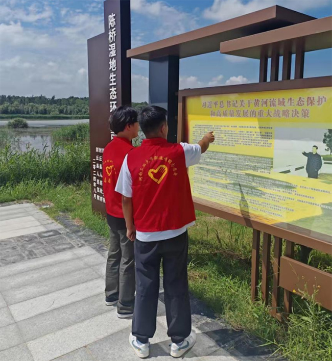02陳橋驛濕地公園:研濕知護(hù),青春悟擔(dān)當(dāng) 隨后,小隊走進(jìn)陳橋驛濕地公園。這里作為黃河流域生態(tài)節(jié)點,水草豐茂、飛鳥棲息,也是生態(tài)保護(hù)實踐的“課堂”。隊員們沿濕地棧道,記錄動植物與生態(tài)修復(fù)成果,學(xué)習(xí)法治與科學(xué)護(hù)濕經(jīng)驗并向小朋友們宣傳。“濕地是‘地球之腎’,保護(hù)它需要科學(xué)與行動。”隊員們交流道,深刻領(lǐng)會生態(tài)保護(hù)的“硬核”與“柔性”力量。