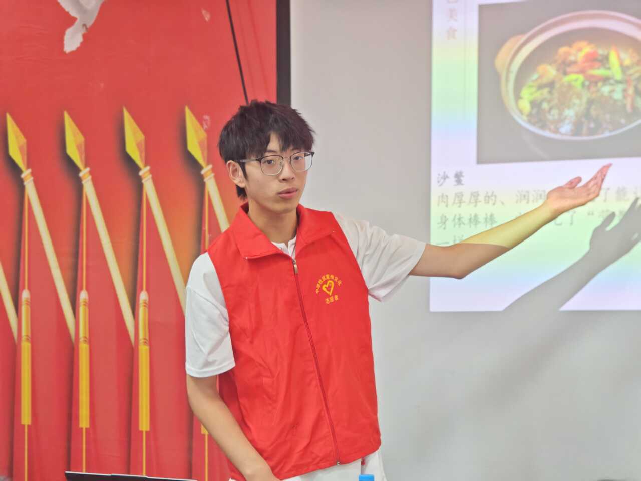 活動(dòng)現(xiàn)場(chǎng),實(shí)踐團(tuán)成員梁亦武以郎溪地標(biāo)南漪湖為切入點(diǎn),通過高清航拍影像與生態(tài)數(shù)據(jù),生動(dòng)展現(xiàn)湖景風(fēng)光與豐富的生物多樣性。在美食文化分享環(huán)節(jié),他以“建平十六鮮”為脈絡(luò),結(jié)合精心制作的美食圖鑒與烹飪工藝動(dòng)畫,從南漪湖大閘蟹的肥美、石佛山黃精雞湯的醇厚講起,深度解析食材特性、傳統(tǒng)烹飪技法與飲食文化淵源,讓小朋友們透過舌尖滋味觸摸家鄉(xiāng)記憶。