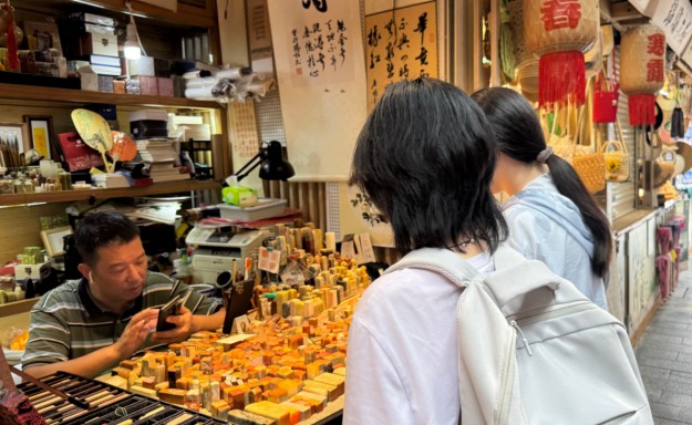 圖為團(tuán)隊(duì)成員采訪郭素齋篆刻店店主章先生。吳雨萌 供圖