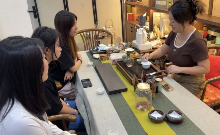 茶廠實(shí)踐后,隊(duì)員們跟著當(dāng)?shù)夭杷噹熩w璐屹開始"茶藝學(xué)習(xí)",探尋茶產(chǎn)業(yè)背后的文化底蘊(yùn),挖掘德旺白茶的產(chǎn)業(yè)價(jià)值。從認(rèn)識(shí)茶具、控制水溫的細(xì)致講究,到"鳳凰三點(diǎn)頭"注水的禮儀傳承,再到品茶時(shí)"靜心生悟"的文化沉淀,指尖動(dòng)作從生硬到嫻熟,隊(duì)員們真切感受到了茶藝文化的厚重。當(dāng)?shù)谝槐铚U裊升起,恰似德旺茶產(chǎn)業(yè)與文化傳承的未來,在青春力量的助力下,正緩緩展開融合創(chuàng)新的全新畫卷。