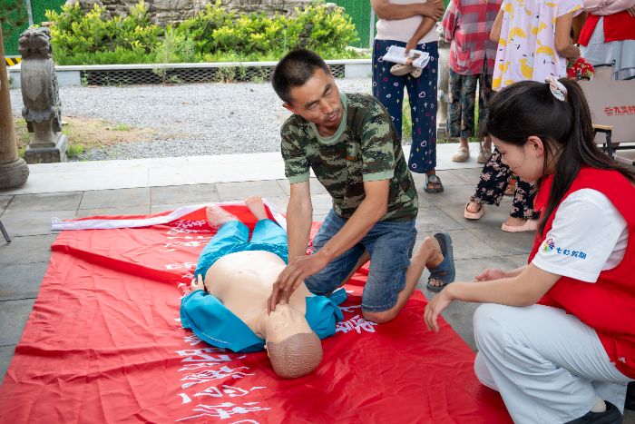 其次,在知識科普方面,實踐團(tuán)成員秉持著“知識傳遞,播撒急救火種”的宗旨,以心肺復(fù)蘇的正確操作為核心內(nèi)容,面向現(xiàn)場的小朋友和居民展示心肺復(fù)蘇急救操作。同時實踐團(tuán)成員還邀請小朋友運(yùn)用假人模型進(jìn)行急救實踐操作,并手把手耐心糾正各種細(xì)節(jié)問題。面對緊張的小朋友,實踐團(tuán)成員以親切溫和的態(tài)度和鼓勵性的話語,幫助他們克服障礙,成功完成心肺復(fù)蘇模擬操作。并鼓勵小朋友們要積極參與實踐,通過親身體驗,深刻掌握心肺復(fù)蘇等重要急救技能,為社會播撒下更多急救知識的火種,也為小朋友們的安全增添了一份保障。