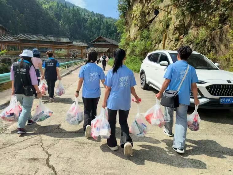 (圖為“陜澳同心·黔行筑夢”實踐隊成員攜帶生活物資走訪村民家)