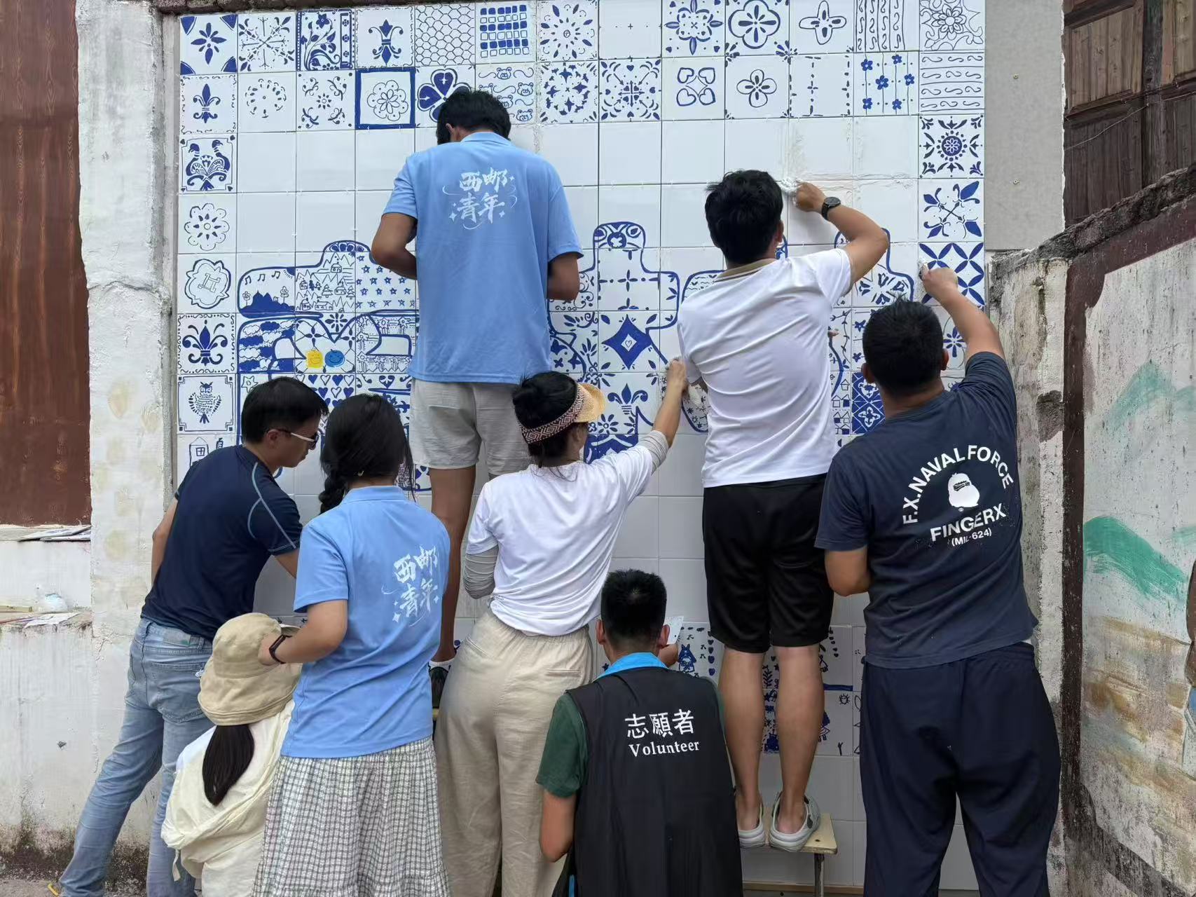 (圖為陜澳兩地志愿者共繪南林村葡磚紀(jì)念墻)