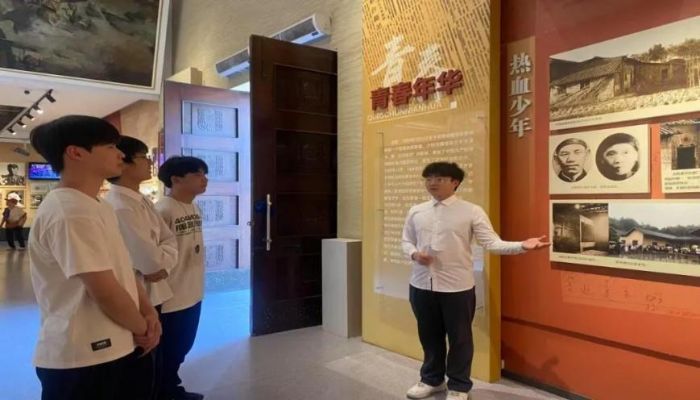 7月11日,實(shí)踐團(tuán)于百家村慘案紀(jì)念館開(kāi)展紅色展演活動(dòng)。郭館長(zhǎng)結(jié)合館內(nèi)史料,生動(dòng)地為實(shí)踐團(tuán)成員們講解百家村慘案的背景與細(xì)節(jié),讓人深切感受那段歲月的沉重與悲壯;團(tuán)隊(duì)成員帶領(lǐng)參觀展區(qū),介紹文物背后故事時(shí),指著先輩的抗?fàn)幤骶吲c手稿說(shuō)道:“這些物品訴說(shuō)著偉大建黨精神教會(huì)我們的真理——堅(jiān)守初心、不屈抗?fàn)帲侥苡诮^境中燃希望、黑暗中辟前路”,讓紅色記憶更鮮活可觸。實(shí)踐團(tuán)成員通過(guò)沉浸式講解回溯歷史,其間上演的話劇《五四五四》,也再現(xiàn)了百年前青年學(xué)子的覺(jué)醒征程,點(diǎn)燃愛(ài)國(guó)熱情,引發(fā)強(qiáng)烈共鳴。