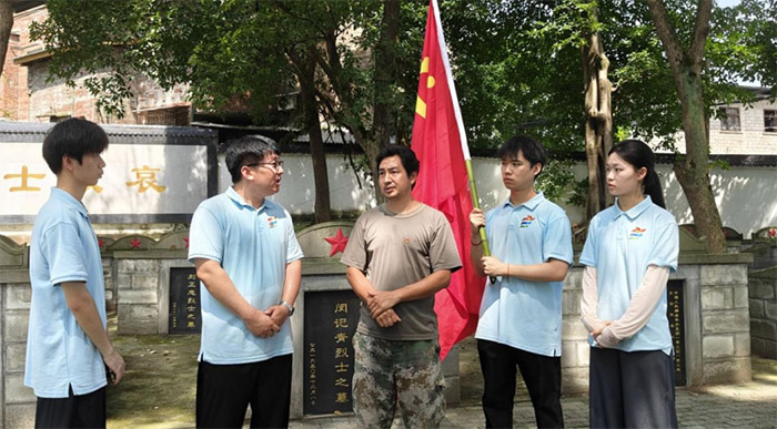 為慶祝中國(guó)共產(chǎn)黨成立104周年,抗日戰(zhàn)爭(zhēng)勝利80周年,緬懷革命先烈豐功偉績(jī),傳承紅色基因,賡續(xù)精神血脈,重慶外語外事學(xué)院“尋韻昌州古郡,煥新永川鄉(xiāng)脈”實(shí)踐團(tuán)于2025年7月15日前往永川區(qū)五間鎮(zhèn)俞家坡烈士陵園開展紅色教育實(shí)踐活動(dòng)。退伍軍人、優(yōu)秀共產(chǎn)黨員榮代來擔(dān)任講解員,帶領(lǐng)實(shí)踐團(tuán)成員一同回憶陵園背后的故事,緬懷那些為國(guó)家和人民英勇獻(xiàn)身的烈士們。
