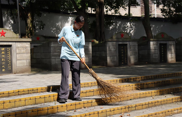 清掃陵園寄哀思,緬懷先烈承遺志 聽完烈士們的故事,實(shí)踐團(tuán)成員們深受觸動(dòng),他們決定用實(shí)際行動(dòng)來表達(dá)對(duì)烈士們的緬懷與敬意。實(shí)踐團(tuán)成員們手持掃帚、抹布,仔細(xì)清掃陵園內(nèi)的落葉,擦拭烈士墓碑。盡管天氣炎熱,但大家卻沉浸在對(duì)烈士英勇事跡的深深感慨之中,懷著沉甸甸的敬意與感動(dòng),以清掃之舉緬懷先烈。團(tuán)隊(duì)成員譚歡在擦拭一塊無名烈士碑時(shí)感慨道:“這些先烈連名字都沒能留下,但他們用生命換來了我們今天的幸福生活。作為新時(shí)代青年,我們更應(yīng)該銘記歷史,傳承他們的精神。”
