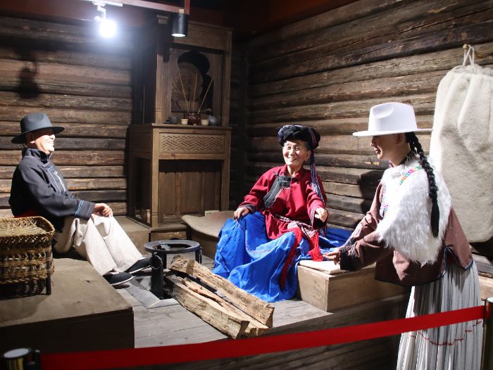此外,博物館詳細(xì)介紹了普米族的民族節(jié)日,民族服飾,民族風(fēng)俗等。如吾昔節(jié)是各地普米族最隆重的一個(gè)節(jié)日,時(shí)間在農(nóng)歷臘月初六、初七、初八日,以初六為歲末,初七為歲首,歷時(shí)3天至半個(gè)月不等,在佳節(jié)到來前,遠(yuǎn)行在外的人都要趕回家,以求全家團(tuán)圓。民族服飾上,女子中年人多穿綠青裙,老年人衣服多為藍(lán)袍或黑袍。裙擺曳地,腰間那道醒目的紅色彩線繡紋,相傳就是神圣的民族遷徙路線圖。配上鑲金銀邊的短衣、牦牛尾假發(fā)、珊瑚瑪瑙項(xiàng)鏈、銀飾,莊重華美。男子則盡顯游牧遺風(fēng):麻布短衣、氈衫、白羊毛腰帶、長刀、鹿皮口袋,英武不凡。