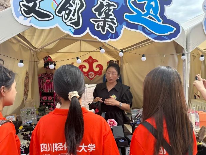 實踐首站,團隊來到中國古羌城,沉浸式感受羌族文化的獨特魅力。在文創(chuàng)店鋪內(nèi),刺繡精美的傳統(tǒng)服飾、紋樣別致的民族飾品讓人目不暇接,店主通過一件件手工藝品,講述著羌族先民對自然的敬畏與對生活的熱愛。“我們鼓勵學生將現(xiàn)代設計理念融入傳統(tǒng)羌繡,讓老技藝跟上新潮流。”阿壩職業(yè)學院的陳老師介紹,師生共同設計的羌繡筆記本、金屬書簽等文創(chuàng)產(chǎn)品已進入市場調(diào)研階段,部分還申請了專利。
