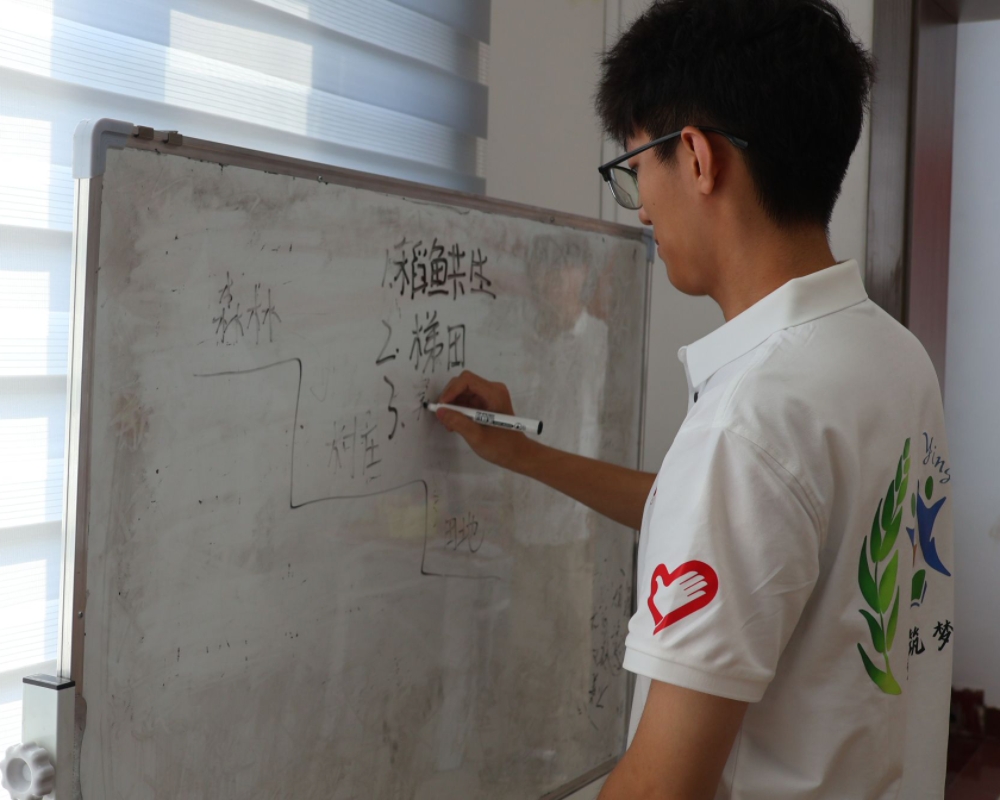 (圖為實(shí)踐團(tuán)成員為小朋友們講解稻魚共生相關(guān)知識(shí) 亓菊攝)