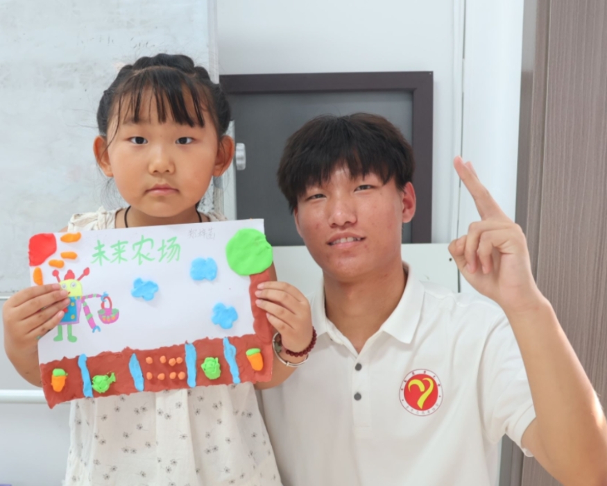 (圖為實(shí)踐團(tuán)成員與小朋制作的未來(lái)農(nóng)場(chǎng)的作品的展示合照 亓菊攝)