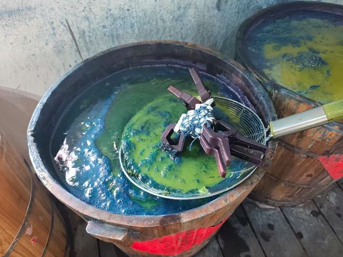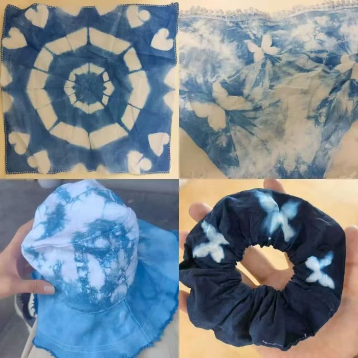 活動中,團隊成員首先通過搜集資料了解了白族扎染悠久的歷史文化、獨特的藝術價值以及復雜的制作工藝。隨后,大家興致勃勃地投入到親身體驗環(huán)節(jié)。從設計圖案、用線扎結布料,到浸入染缸反復浸染、氧化,最后拆線、漂洗、晾曬,每一個步驟都親手完成。看到原本潔白的布料在自己手中逐漸呈現(xiàn)出藍白相間、意趣天成的美麗花紋,每一位隊員都充滿了成就感和喜悅。