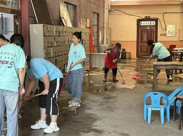 十一點(diǎn)三十分,最后一位老人放下碗筷。實(shí)踐團(tuán)成員迅速接過清潔重任,分成三組展開志愿服務(wù):清潔組三人手持高壓水槍沖刷地面油污,水流沖擊聲瞬間蓋過電視聲響;擦拭組五人擰干抹布,逐張清理餐桌;歸整組兩人合力搬運(yùn)沉重座椅。水流沖刷地面的嘩嘩聲、掃把清除污漬的沙沙聲、拖把收尾的摩擦聲瞬間在頤養(yǎng)之家回響。汗珠沿著年輕的臉龐滑落,浸濕了藍(lán)色隊(duì)服,但無人停下。一位成員彎腰用力擦拭桌腿時(shí)感嘆到:“一遍下來腰就酸了,兩位奶奶五年如一日的堅(jiān)持真是了不起。”