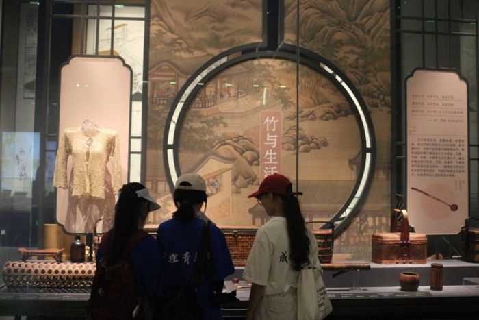 一踏入博物館,琳瑯滿目的竹制器物便即刻抓住了隊(duì)員們的視線。展區(qū)里擺放著多種多樣的竹制用品:兼具實(shí)用性的竹編袋、竹筐、竹篩,還有精巧的竹簧制品等,這些物件直觀地展現(xiàn)出竹子在日常生活中的廣泛融入。成理的青年們細(xì)致觀察,并用相機(jī)把這些凝結(jié)著先民智慧的物件細(xì)節(jié)留存下來。